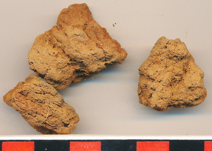 Szabálytalan alakú, kicsi téglaszínű, morzsolódó anyagú paticsrög.