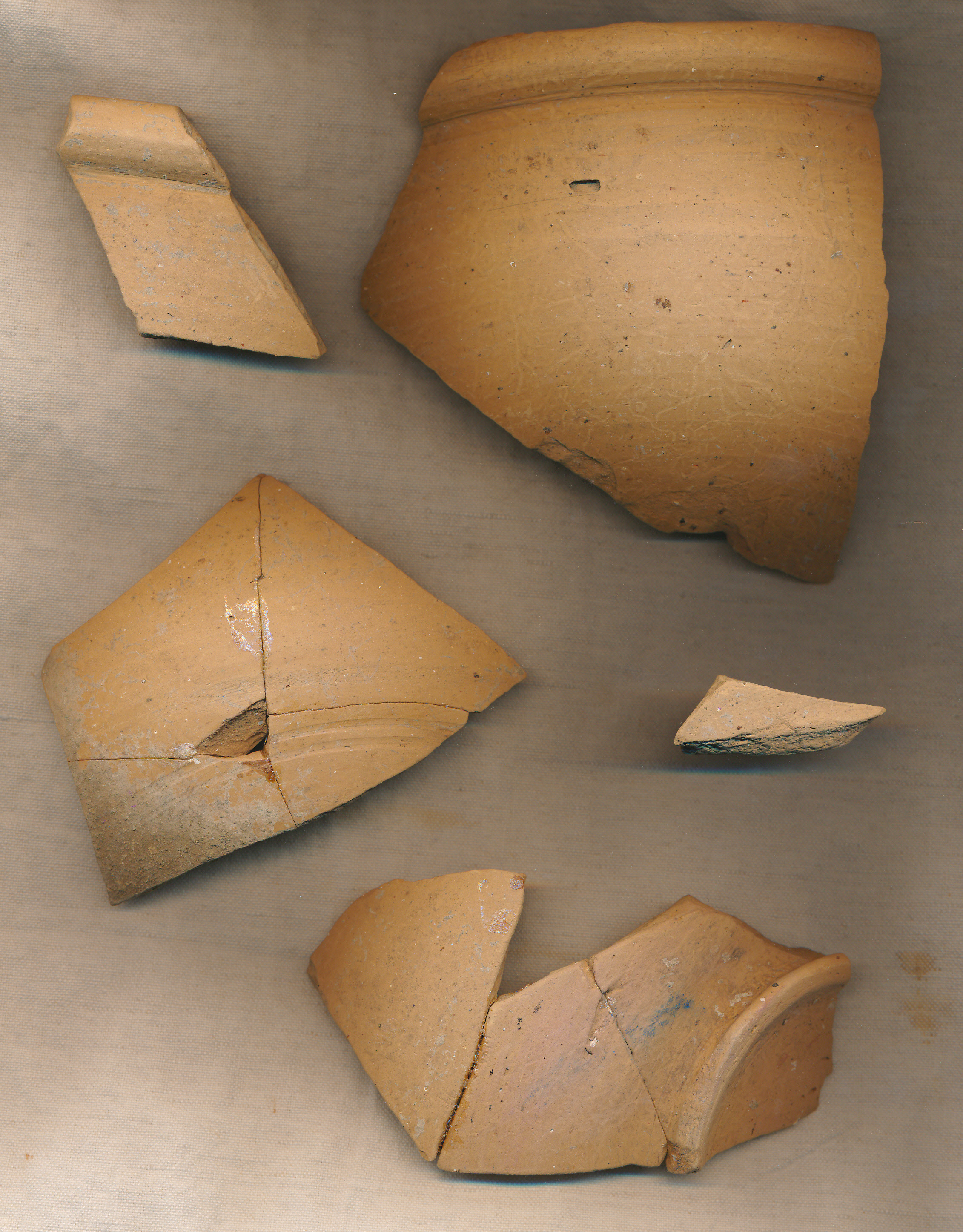 Téglaszínű, külső felületén simított, duzzadt peremű, félgömbös, talpgyűrűs tál töredékei. Az egyik töredék4 db-ból, egy másik 3 db-ból ragasztott.