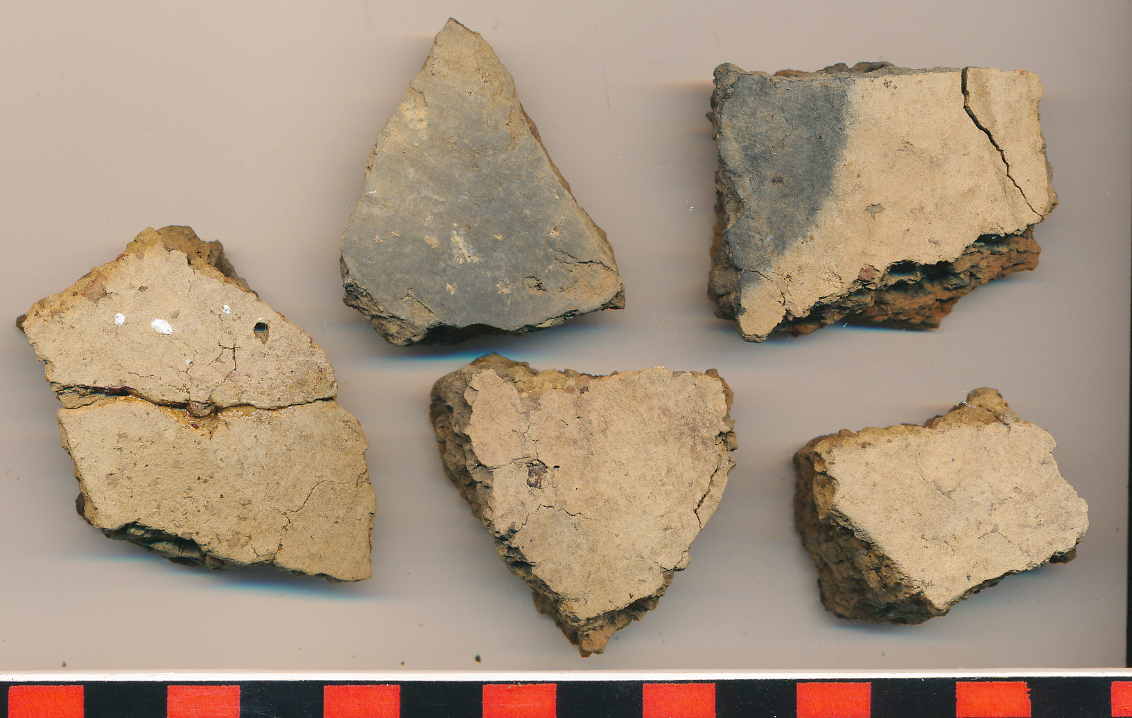 Sárga külső felületű, 1-1 darabon szürke, illetve fekete foltos, helyenként szürke törésű, kerámiazúzalékkal erősen soványított, omlékony anyagú, kívül-belül eldolgozott felületű edény töredékei. Az egyik 2 db-ból ragasztott.