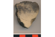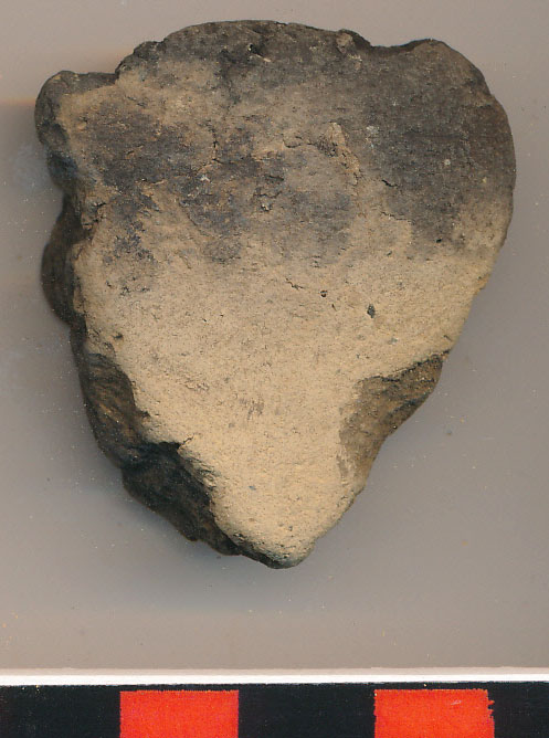 Sárga külső felületű, fekete törésű, kevés kerámiazúzalékkal soványított, korong nélkül készített kisebb edény vastag falú, kívül eldolgozott felületű, kicsit omlékonyabb oldaltöredéke.