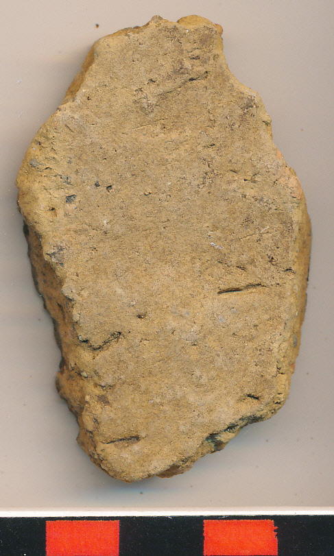 Sárga, belül fekete foltos, durvább kidolgozású egyenes oldaltöredék.
