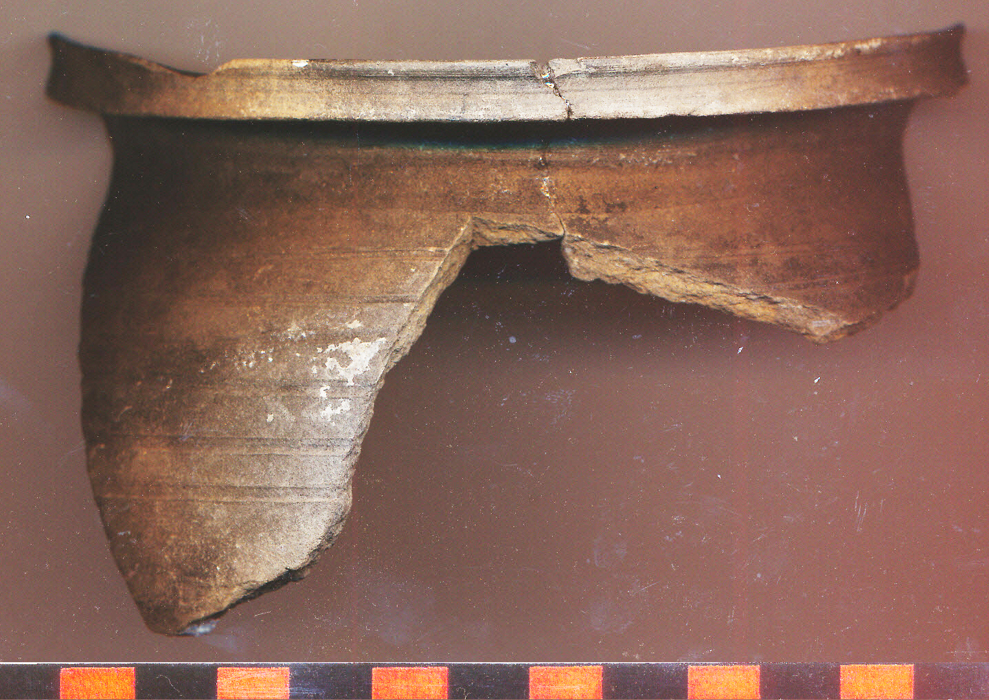 Fekete, kissé homokos anyagú, vékony falú, korongolt fazék kihajló, ferdén levágott és tagolt peremmel, erősen íves nyakkal, gömbölyded vállal. Vállán 7 körbefutó karcolt vonal díszíti. 2 db-ból ragasztott.