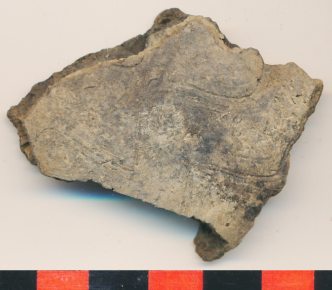 Fekete foltos sötétszürke külső felületű, belsejében piszkossárga, fekete törésű, kerámiazúzalékkal soványított, enyhén íves oldaltöredék 2 köteg halványan látszó, sekélyen karcolt hullámvonal köteggel.