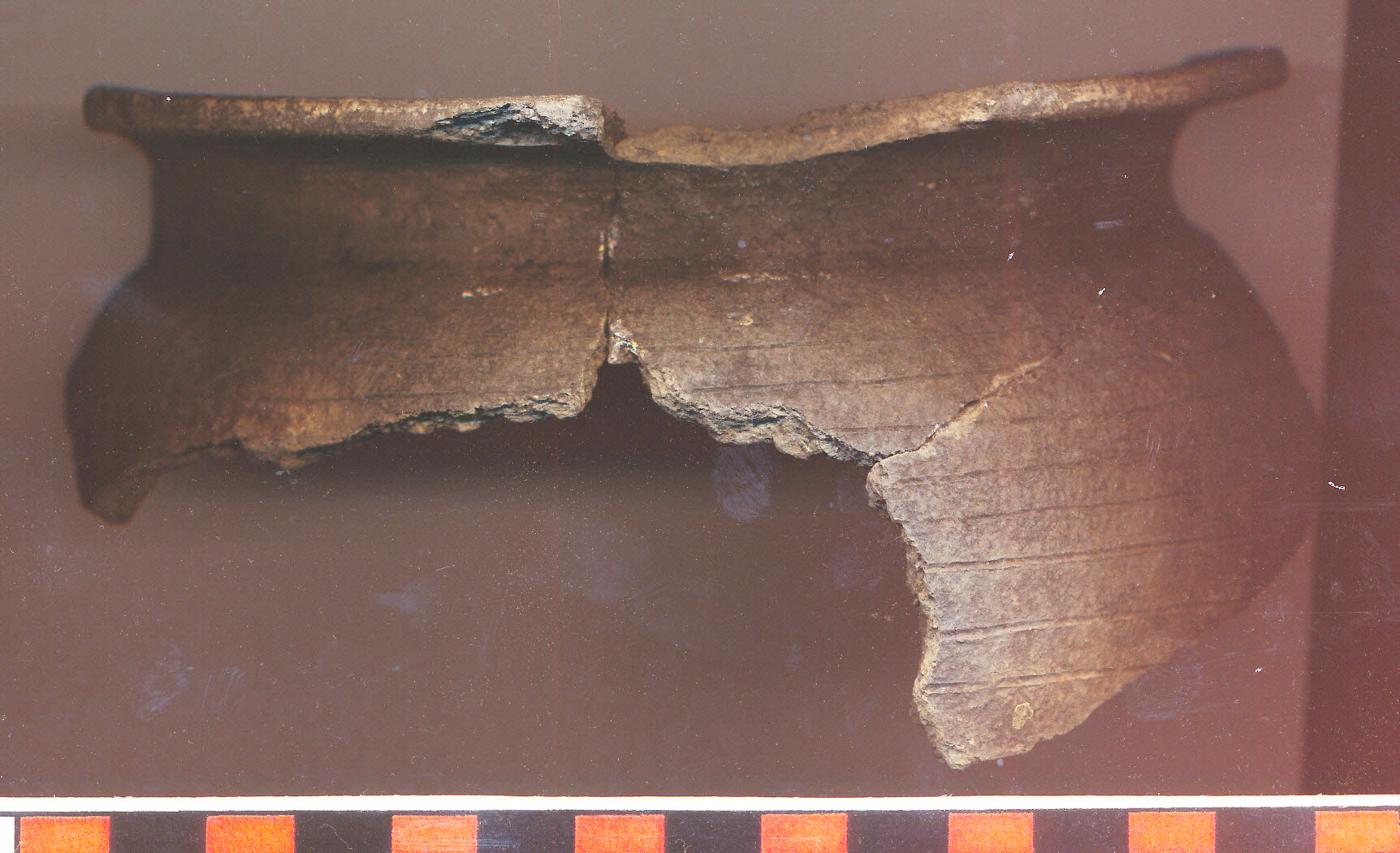 Fekete, erősen homokos anyagú, vékony falú, korongolt fazék erősen kihajló peremmel, erősen íves nyakkal, gömbölyded vállal. Vállán sűrű körbefutó karcolt vonalazás díszíti. 3 db-ból ragasztott.