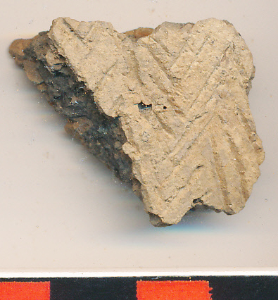 Kívül-belül sárga felületű, a belsejében elsimított, fekete törésű, kevés kerámiazúzalékkal soványított, enyhén íves oldaltöredék, külsején egymásba fonódó, sűrű, mély cikkcakkvonal köteggel.
