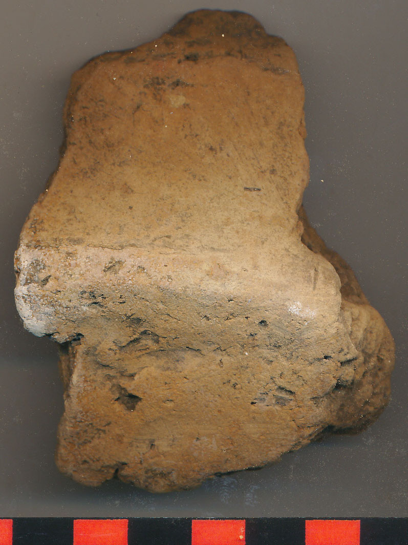 Téglaszínű, kevés kerámiazúzalékkal soványított, korong nélkül készített nagyobb edény belül eldolgozott felületű, vastag falú, durvább kivitelű vágott aljtöredéke az igen laposan induló felmenő fal kezdetével.