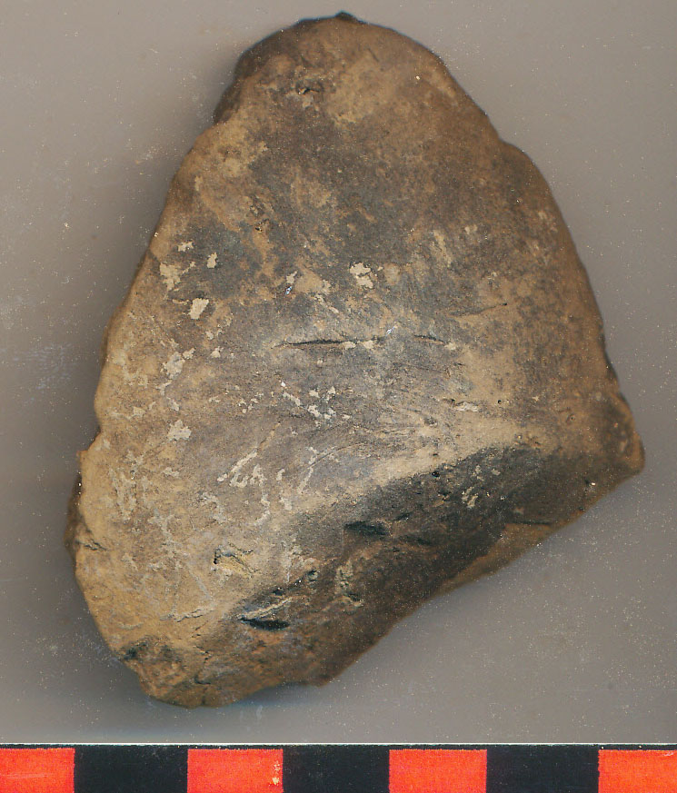 Téglaszínű, kívül fekete, belül szürke foltos, kevés kerámiazúzalékkal soványított, korong nélkül készített kisebb edény kívül-belül eldolgozott felületű, vékony falú, vágott aljtöredéke az ívesen induló felmenő fal kezdetével.