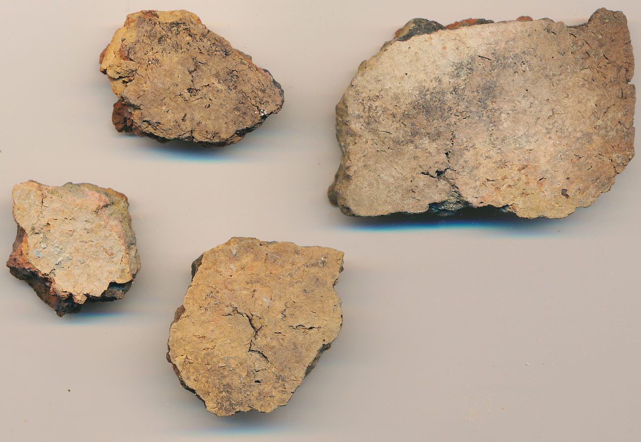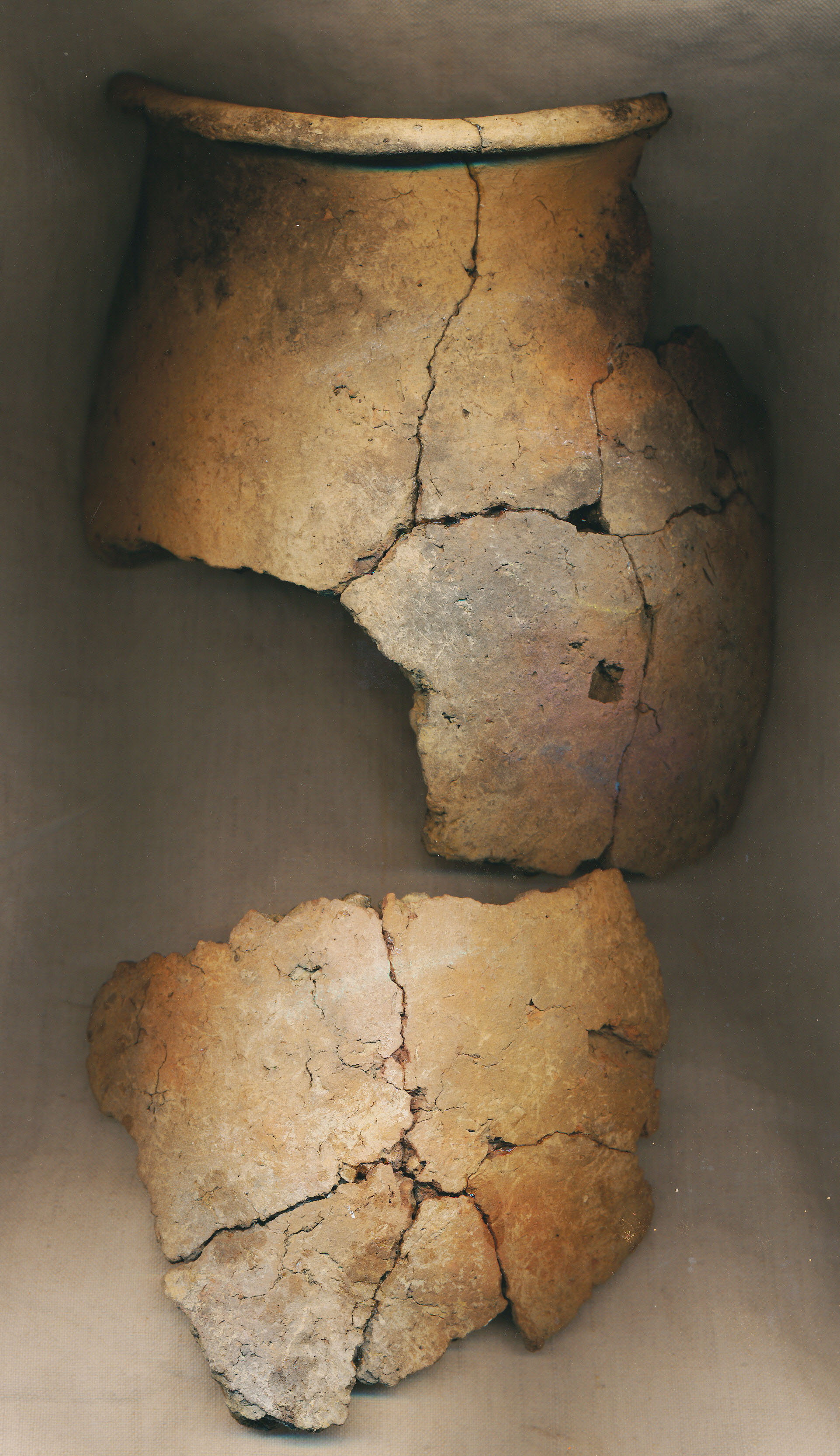 Téglaszínű, fekete foltos, fekete törésű, kerámiazúzalékkal soványított, korong nélkül készített, kihajló, elvékonyodó peremű, vállban bővülő, eldolgozott felületű fazék perem- és oldaltöredékei.
