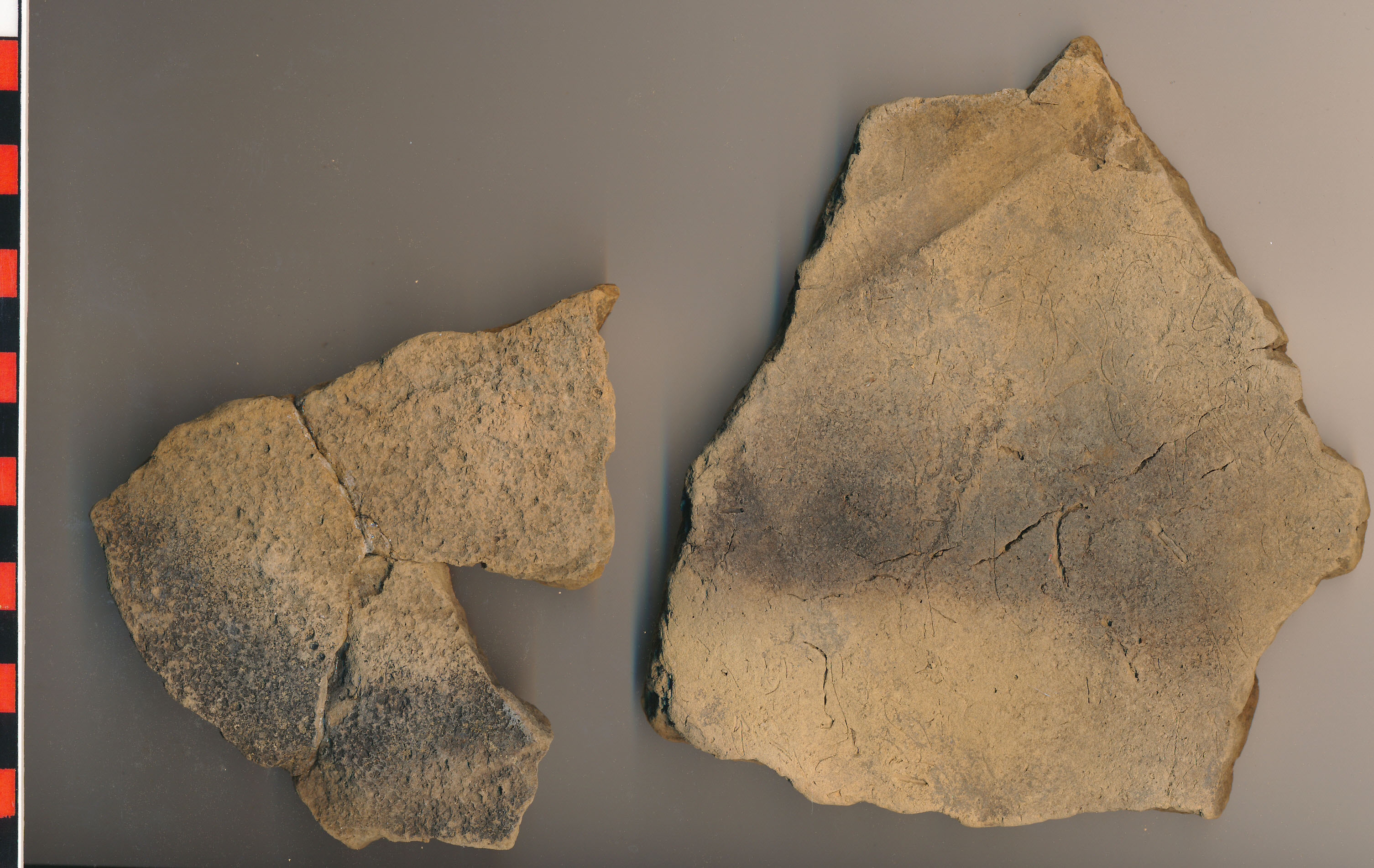 Téglaszínű, fekete foltos, korong nélkül készített nagy edény lapos, egyik oldalán erősen durvított aljtöredékei a felmenő fal nélkül. Az egyik belső oldalán besimított, íves széles árok látszik. A másik 3 db-ból ragasztott.