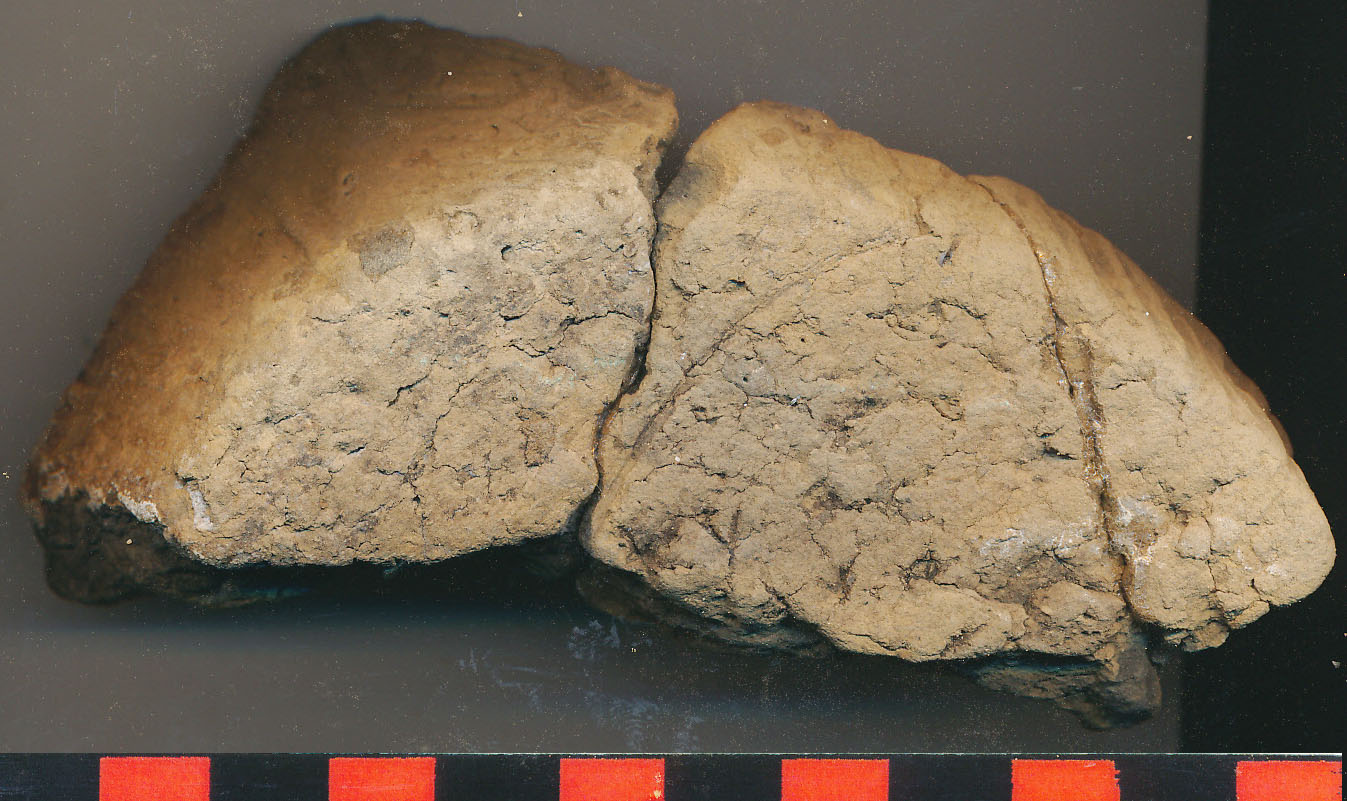 Kívül drapp, belül fekete foltos téglaszínű, szürkésfekete törésű, kevés kerámiazúzalékkal soványított, korong nélkül készített kisebb, vékonyabb falú edény vágott aljtöredéke a felmenő fal indításával. A külső felületen az eldolgozás durva nyomai látszanak. 3 darabból ragasztott.