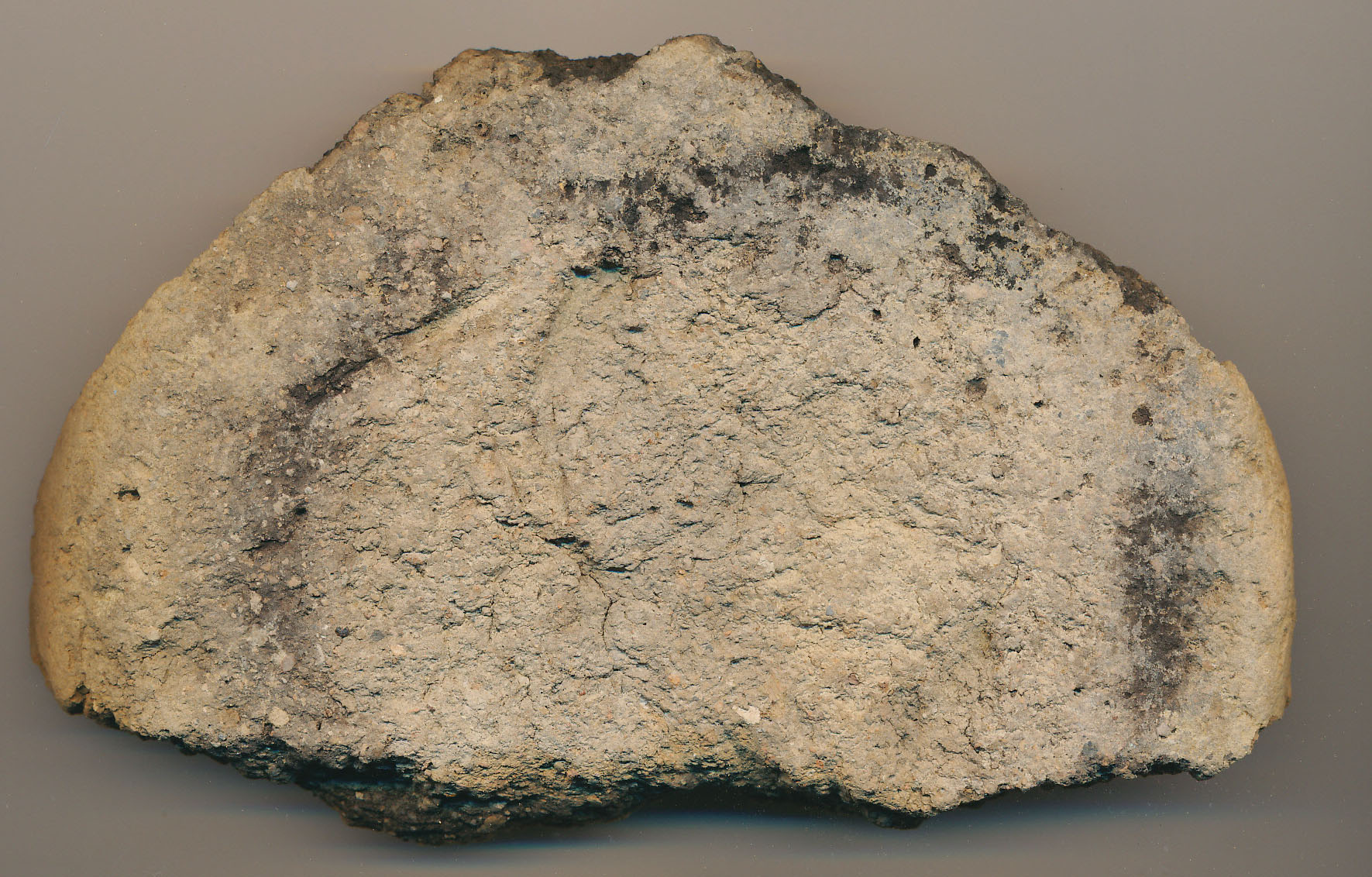 Kívül-belül drapp felületű, törésében vékony fekete rétegű, korong nélkül készített, kerámiazúzalékkal soványított nagyobb edény vágott aljtöredéke a felmenő fal nélkül.