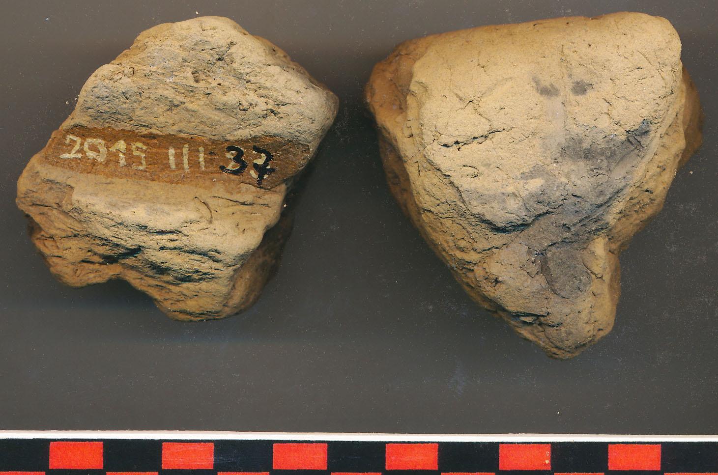 Téglaszínű, homokos anyagú, vastag falú, korong nélkül készített , nagy átmérőjű, talán hordozható tűzhely vágott aljtöredékei.