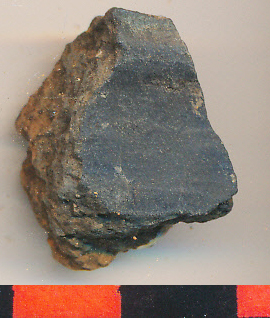 Fényezett fekete külsejű, belsejében téglaszínű, kerámiazúzalékkal soványított miniatűr oldaltöredék.