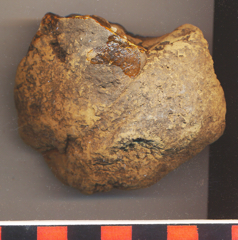 Sárgástéglaszínű külső felületű, szürke törésű, szabálytalan gömb alakú, pelyvás (?) soványítású agyagtárgy töredéke. Valószínűleg nehezék.