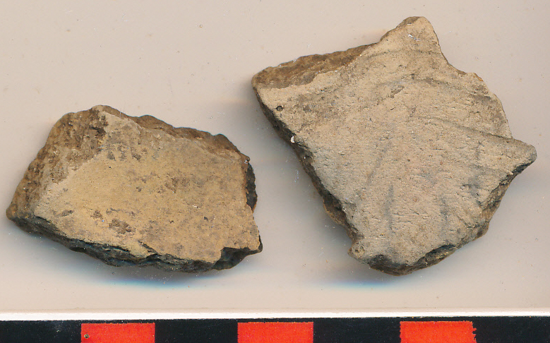 Kívül-belül eldolgozott, drapp, kevés kerámiazúzalékkal soványított kopott oldaltöredékek.