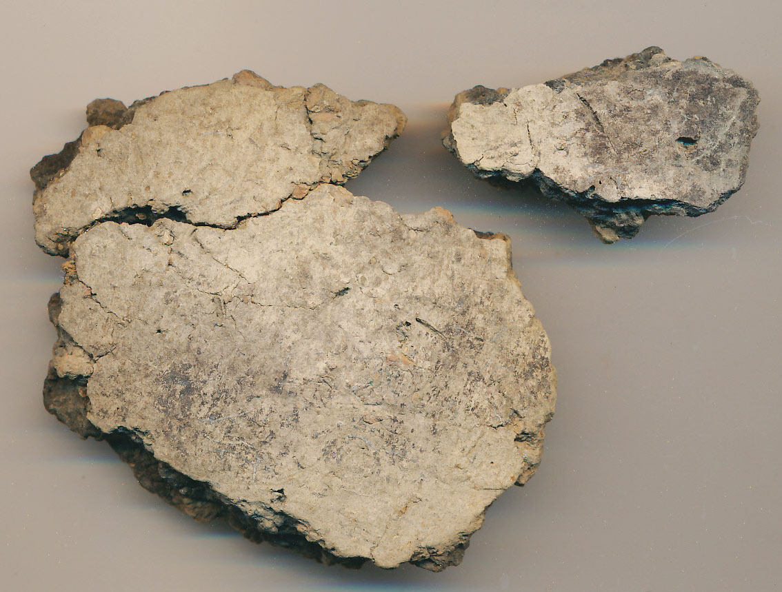 Kívül-belül piszkosszürke felületű, fekete törésű, kerámiazúzalékkal soványított, korong nélkül készített edény két omlékony oldaltöredéke.