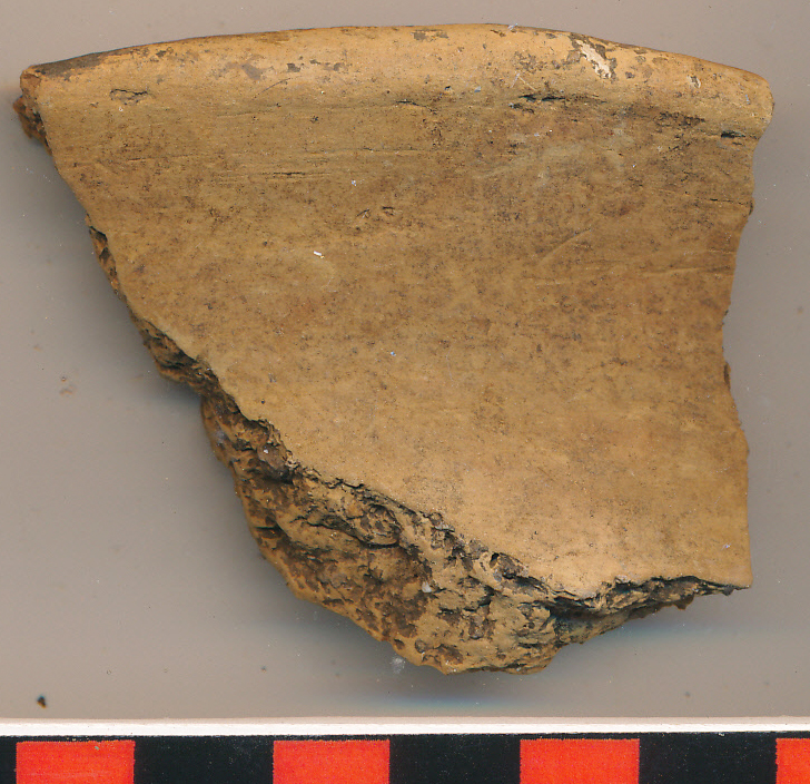 Világos téglaszínű, simított külső-belső felületű, erősen kihajló, legömbölyített perem- és íves nyaktöredék.