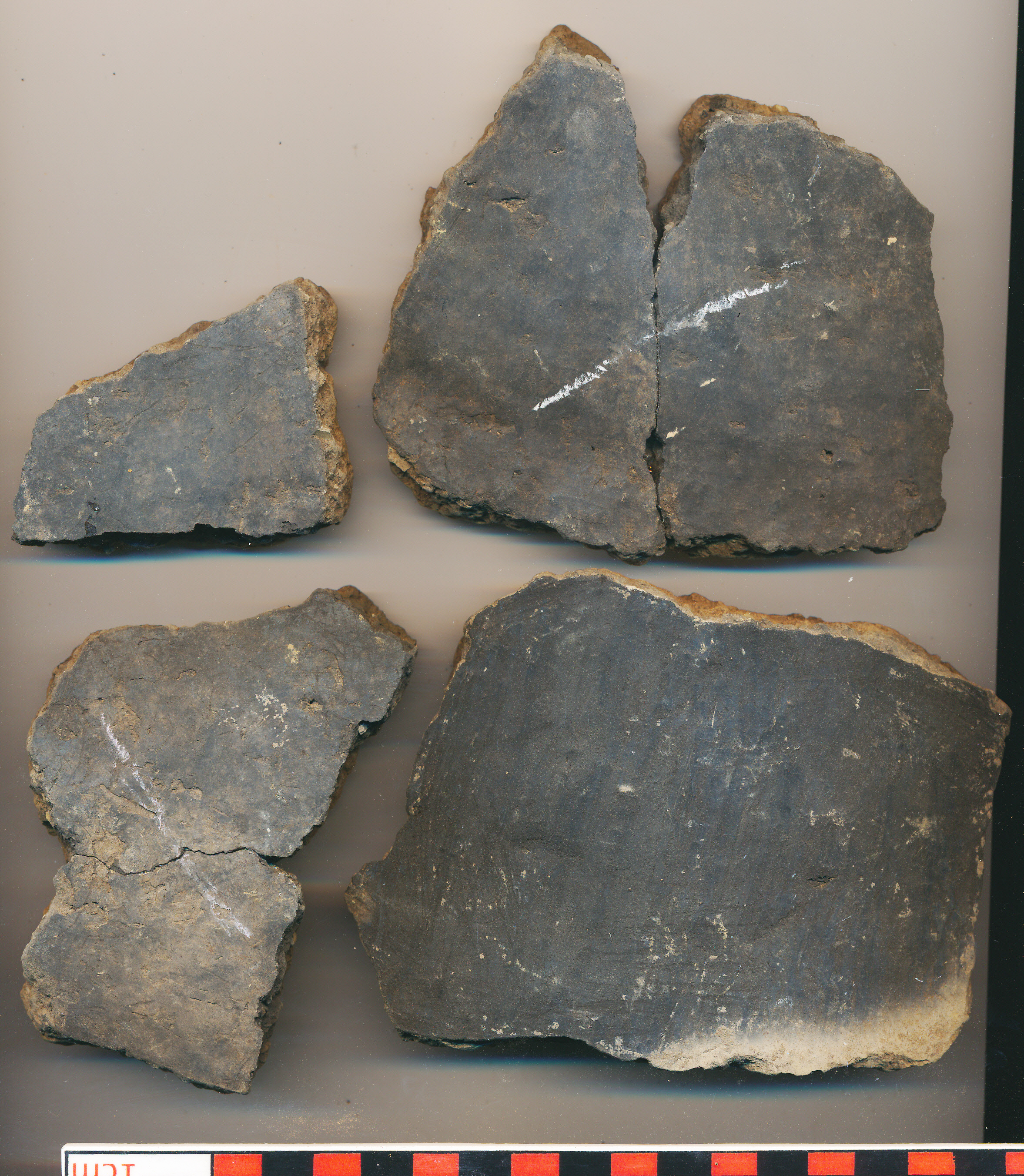 Fekete, elsimított külső felületű, kívül fekete, belül sárga rétegből összetevődő, kerámiazúzalékkal soványított, vastag falú nagy edény oldaltöredékei, az egyiken sárga folttal. Közülük kettő 2 db-ból ragasztott.
