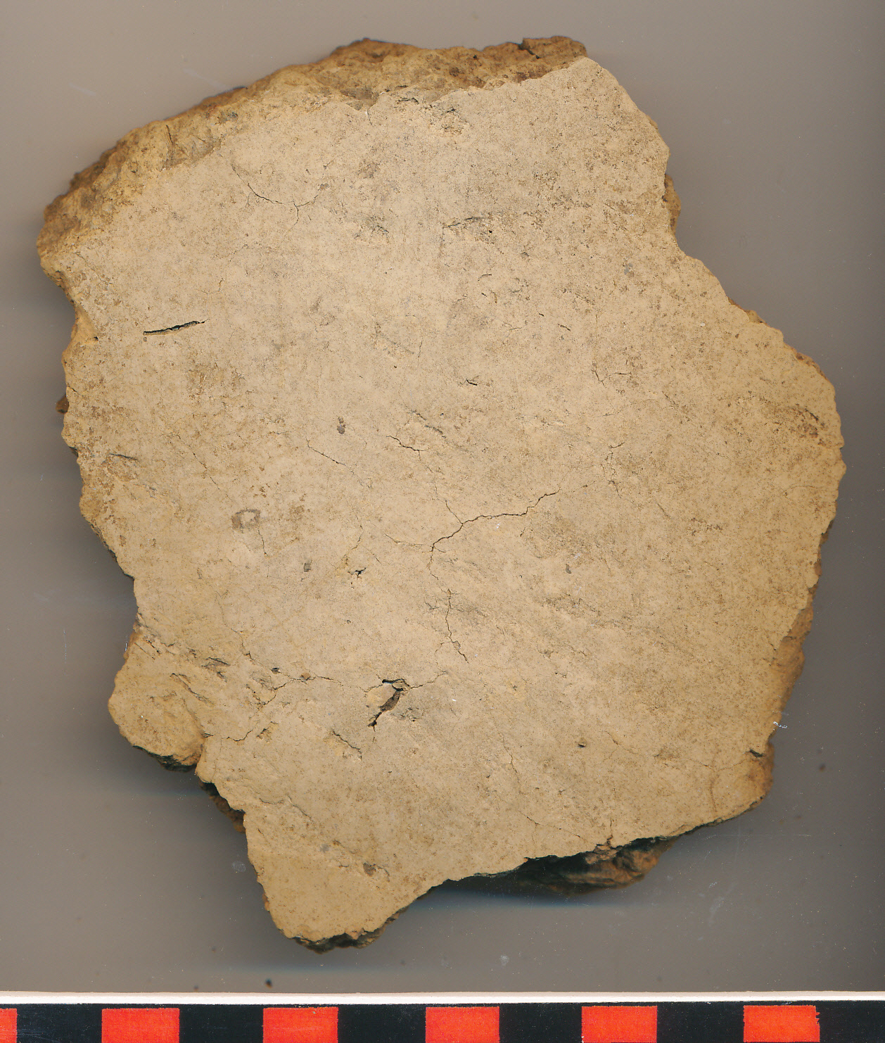 Sárga, kívül simított - talán engobe-os - belül eldolgozott felületű nagy, vastag falú edény egészen kicsit íves oldala.