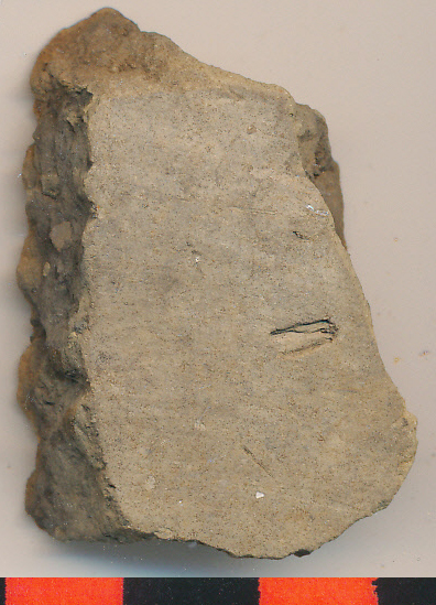 Szürke, belső felületén elsimított sárga, kívül is eldolgozott kisebb edény oldaltöredéke.