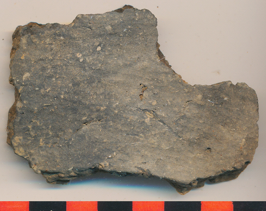 Barnásfekete, belül téglaszínű foltos, eldolgozott, kerámiazúzalékkal soványított oldaltöredék.
