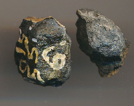 Szabálytalan kocka alakú kis fekete, nehéz, tömött salakdarabok.