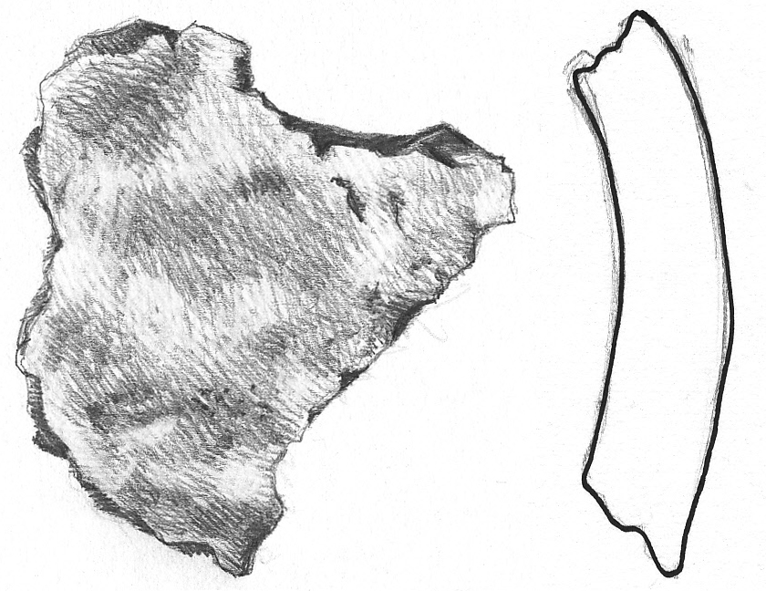 Piszkos drapp külső felületű, fekete törésű, kerámiazúzalékkal soványított, korong nélkül készített, egyenetlen felületű kisebb edény íves oldaltöredéke.