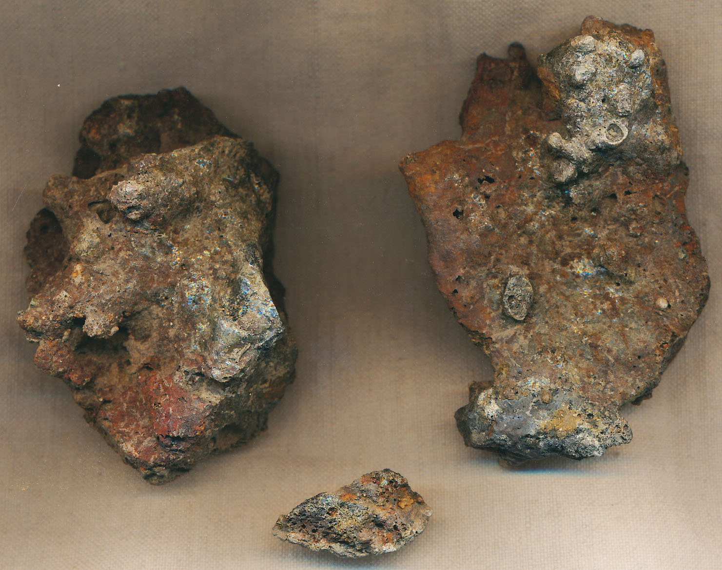 Szabálytalan alakú, üveges-hólyagosra égett nehéz szürke salakdarabok.