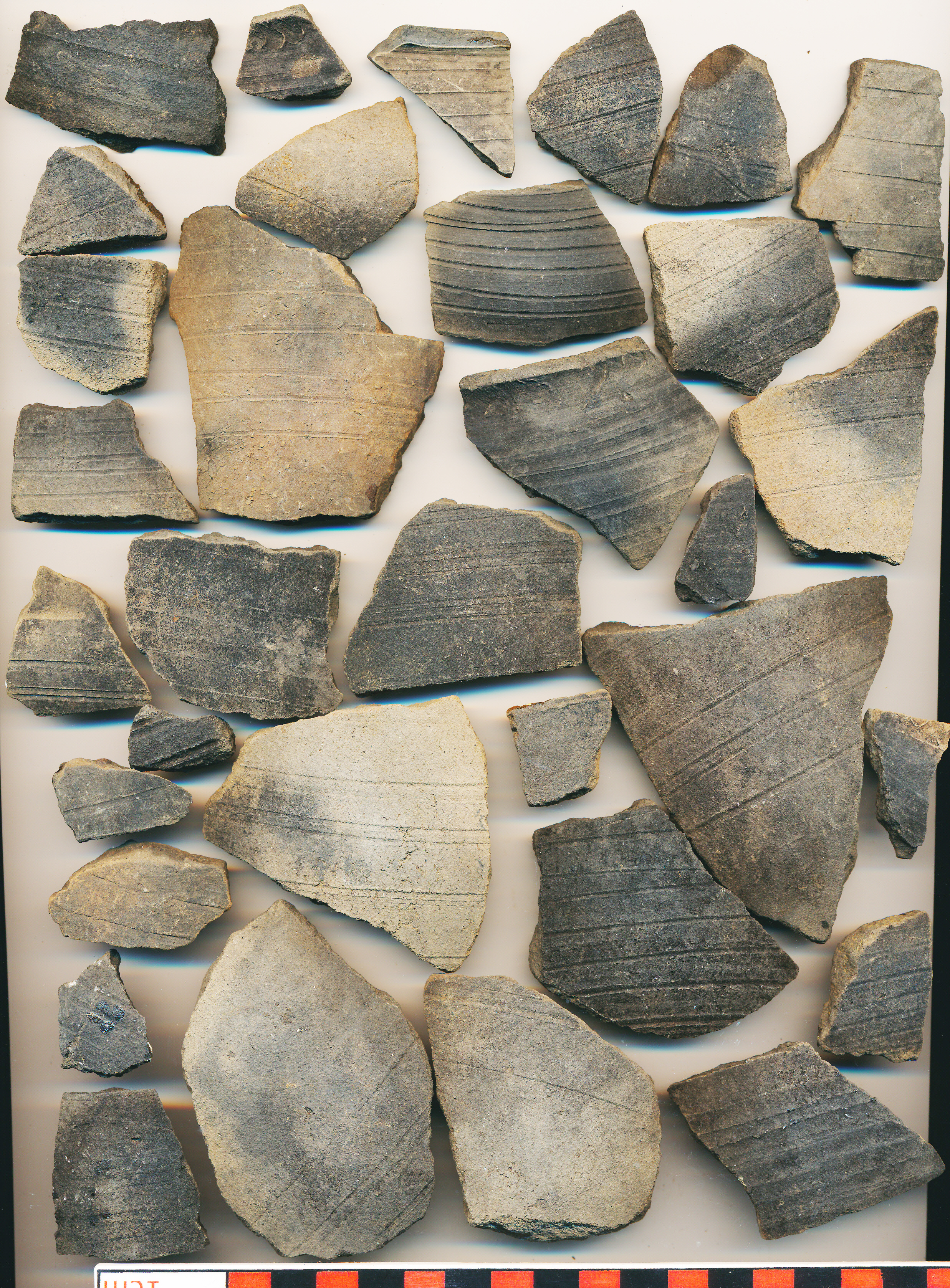 Szürke, illetve barnás, több esetben fekete koromfoltos, homokos anyagú, korongolt oldaltöredékek karcolt körbefutó vonalakkal díszítve. Az egyiken két hullámvonal bekarcolás van, egy másikon a nyak tövénél függőleges, félkörös körömbenyomásokból kiképzett díszítősor.