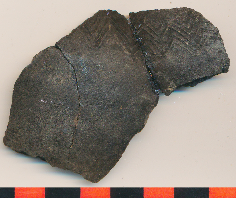 Fekete, homokkal soványított, korongolt, vékony falú kisebb edény íves hastöredéke a vállon befésült széles hullámköteggel. 3 db-ból ragasztott.