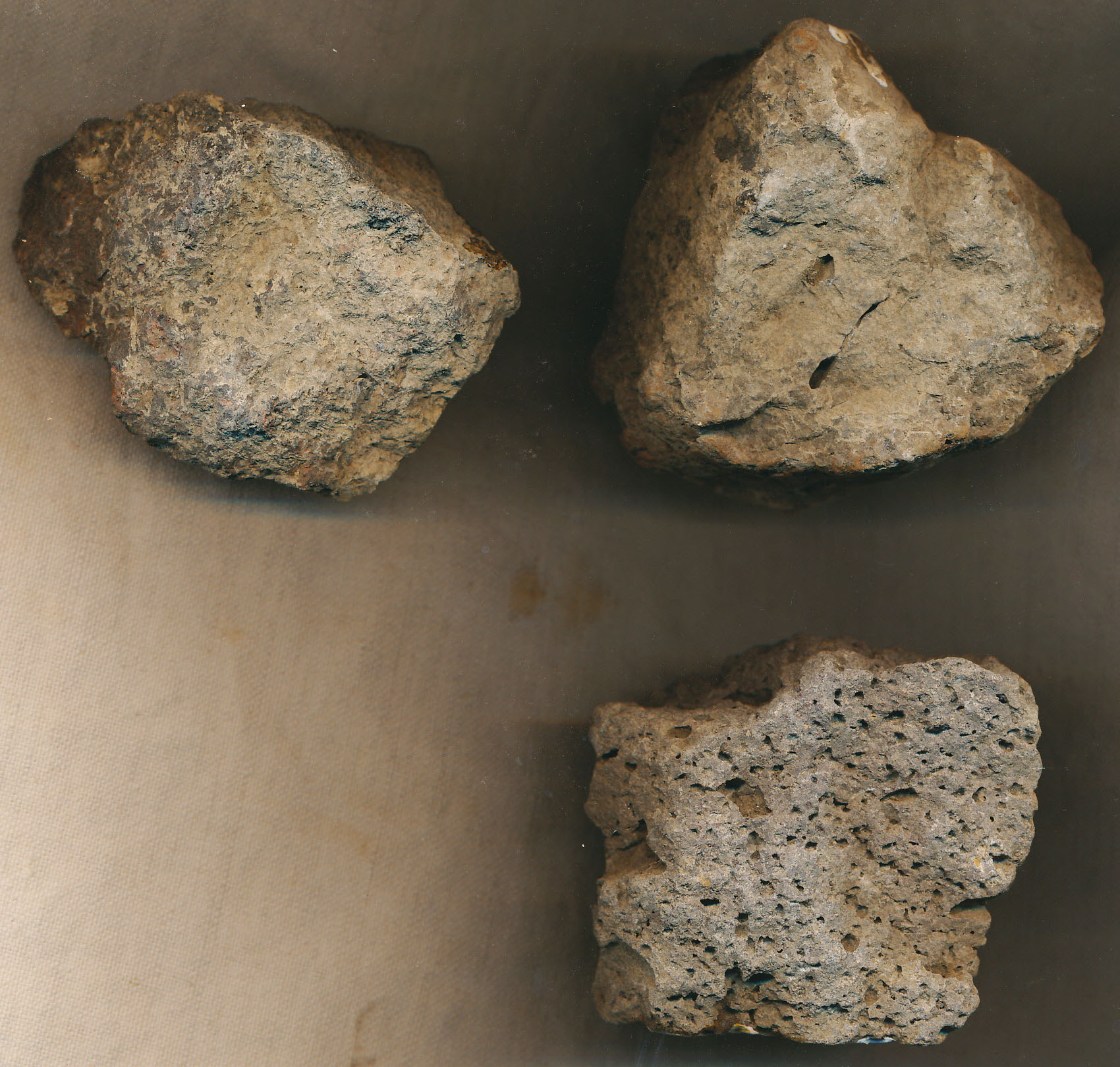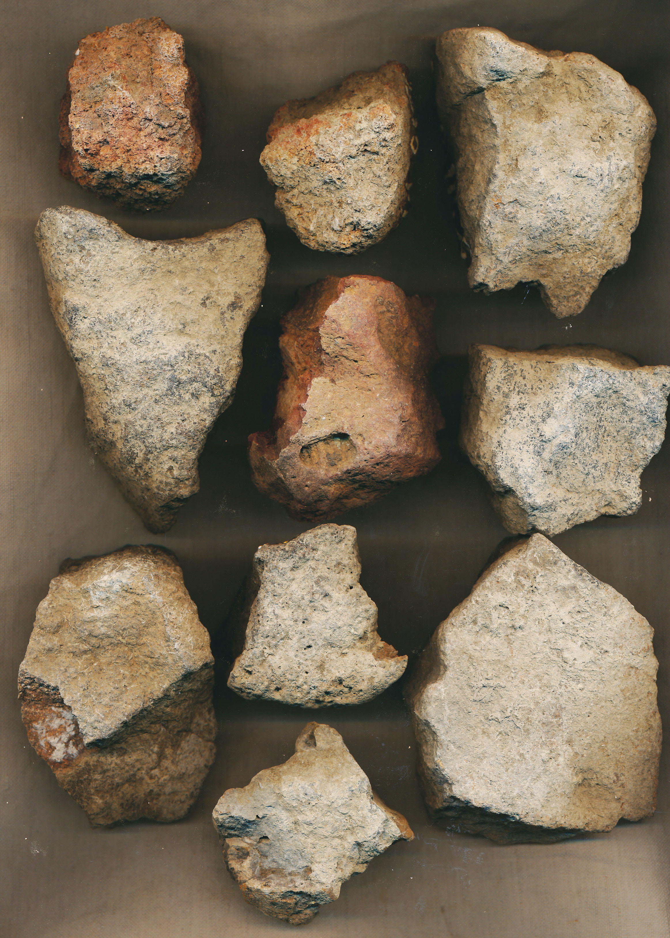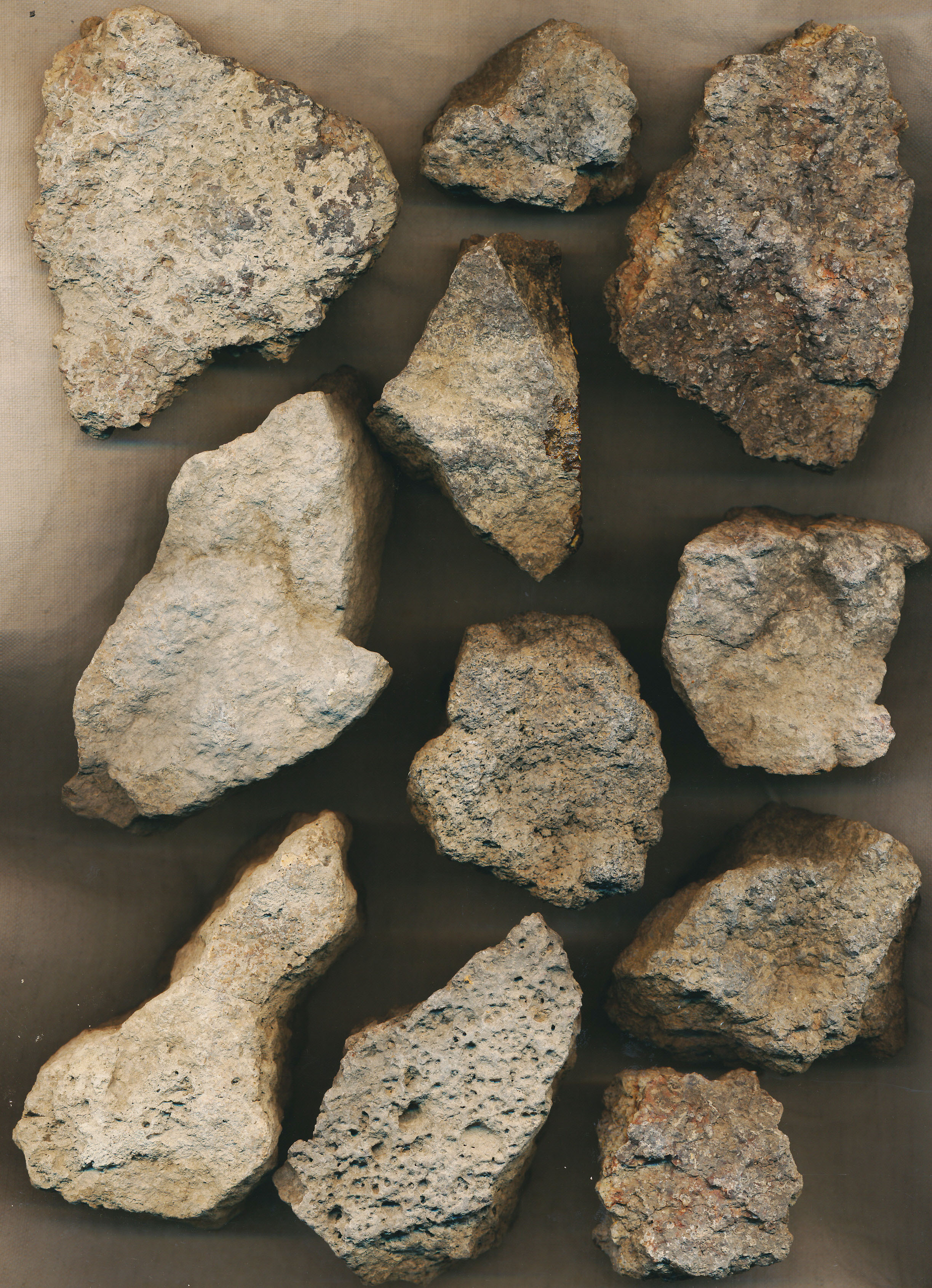 24 db kisebb-nagyobb, szabálytalan alakú, többnyire szürke (2 piros) szemcsés kő (andezit). Némelyik égett.