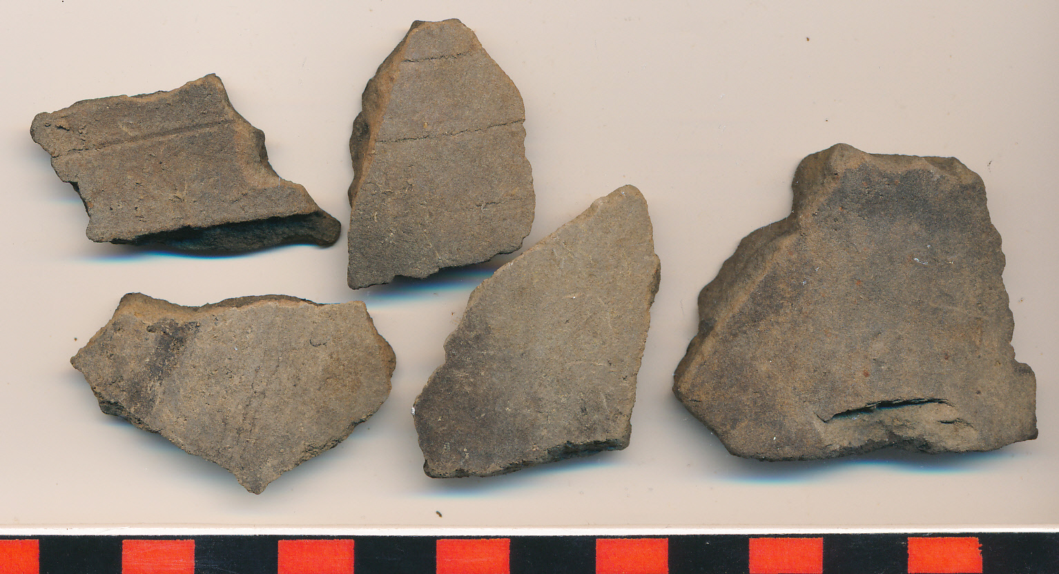 Barna külső felületű, fekete törésű, kevés homokkal soványított, korongolt oldaltöredékek. Az egyiken egy karvolt vonal fut körbe.