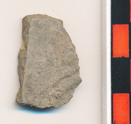 Sötétszürke, homokos anyagú, korongolt, vékony falú edény egyenes oldaltöredéke sekélyen benyomott hullámköteg díszítés részletével.