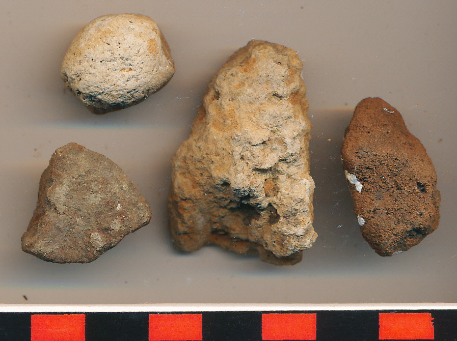 Világos téglaszínű, homokos anyagú, szabálytalan alakú (az egyik gömbölyű), morzsolódó paticsrögök.