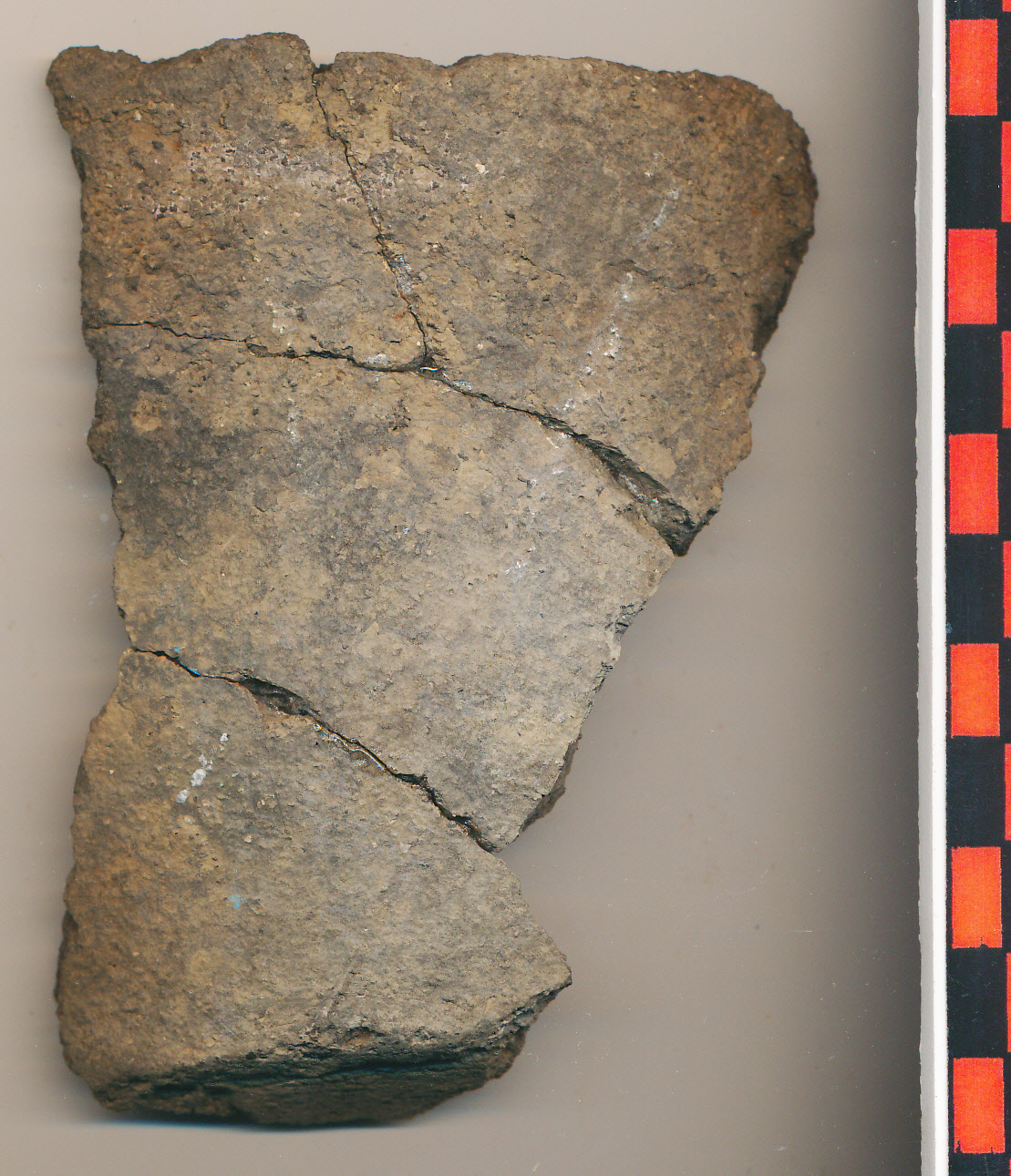 Sötétszürke, apró kavicsos anyagú, korongolt, vékony falú edény vágott alja a felmenő fal indításával. 4 db-ból ragasztott.