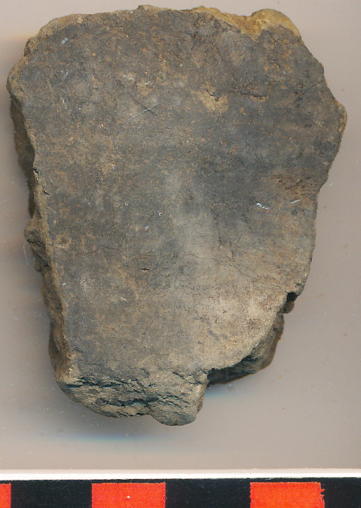 Fényezett sárga foltos fekete külső felületű, szürke törésű, kerámiazúzalékkal soványított edény oldaltöredéke.