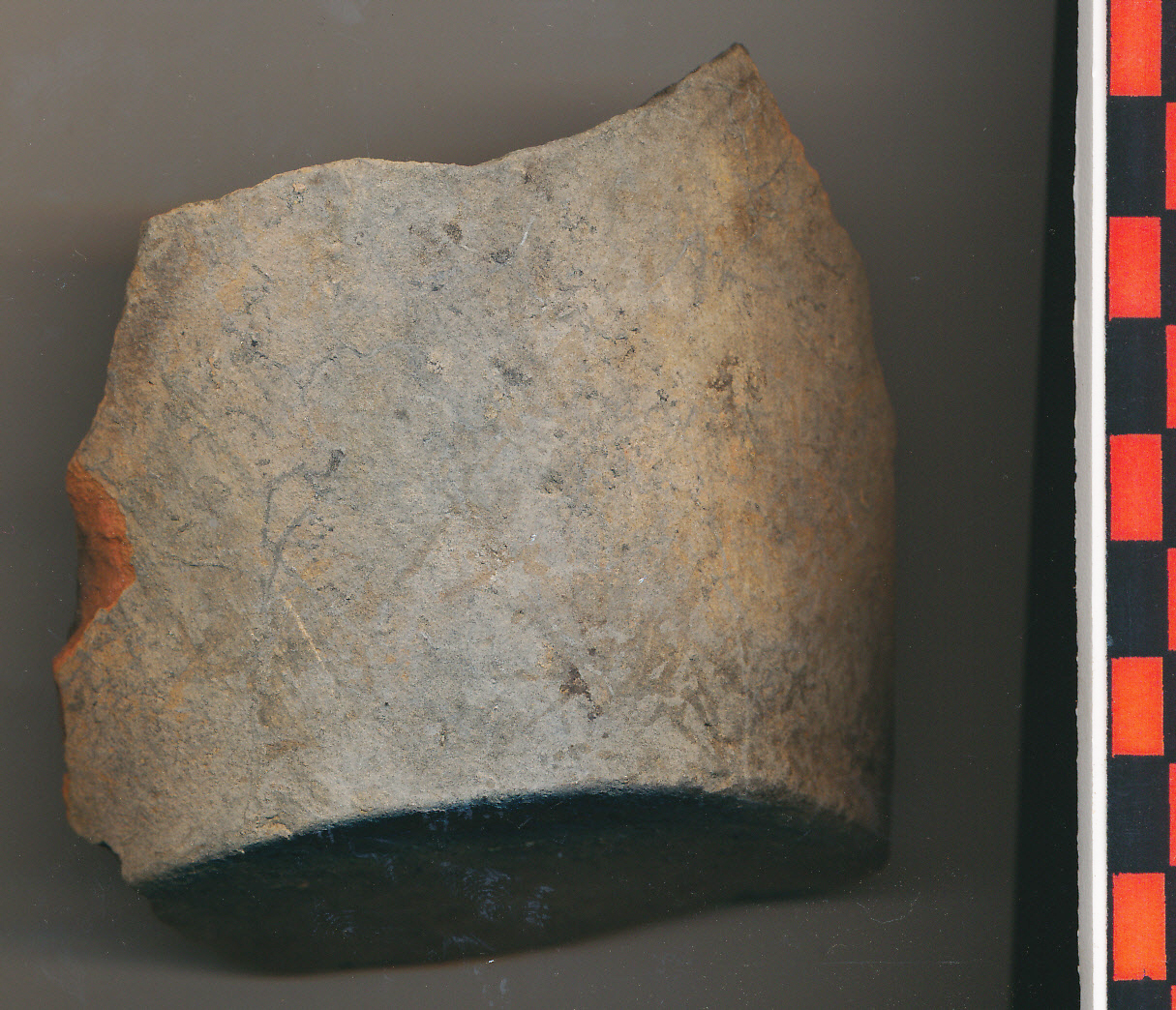 Sötétszürke, kívül téglaszínű foltos, belül kormos, fekete, homokos anyagú, korongolt, vékony falú edény vágott alja a felmenő fal indításával.