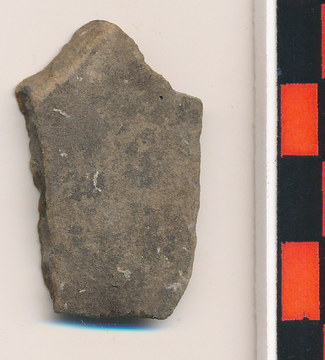 Sötétszürke, homokos anyagú, korongolt, vékony falú edény kis oldaltöredéke.