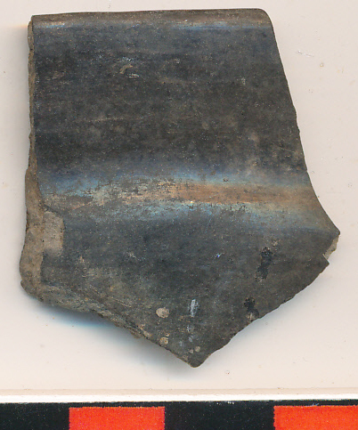 Kívül-belül fényezett felületű, fekete kis edény meredeken kifelé tartó, elvékonyodó pereme és íves vállának indítása.