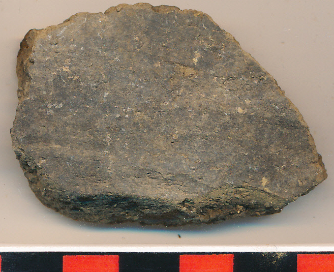 Fényezett belső, eldolgozott külső, szürkésfekete felületű, szendvicses fekete-sárga-szürke törésű, szürke maggal, kevés kerámiazúzalékkal soványított edény oldaltöredéke.