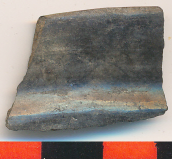 Kívül-belül fényezett felületű, fekete kis edény meredeken kifelé tartó, elvékonyodó pereme és íves vállának indítása. Az előző edény töredéke.