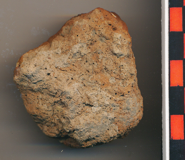 Szabálytalan alakú barnás téglaszínű, omlékony tapasztásdarab.