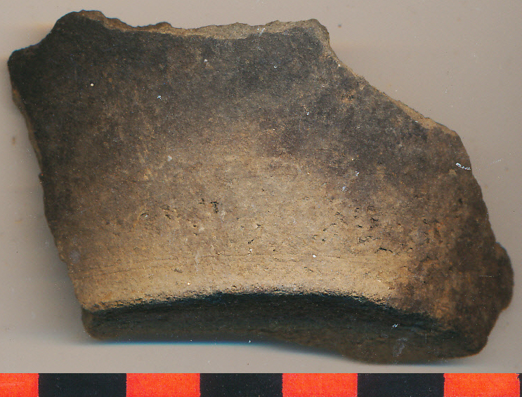 Drapp, kívül fekete foltos, fekete törésű, homokos anyagú, korongolt, vágott alj.