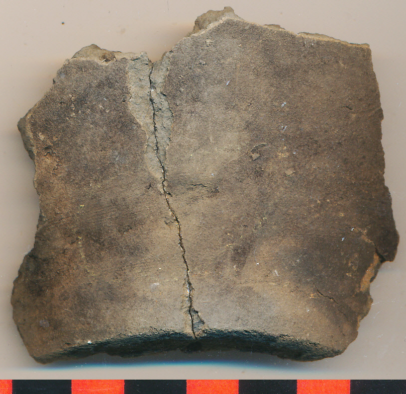 Sötétszürke külső felületű, belül világosabb, homokos anyagú, korongolt oldaltöredék a vágott alj indításával. 2 db-ból ragasztott.
