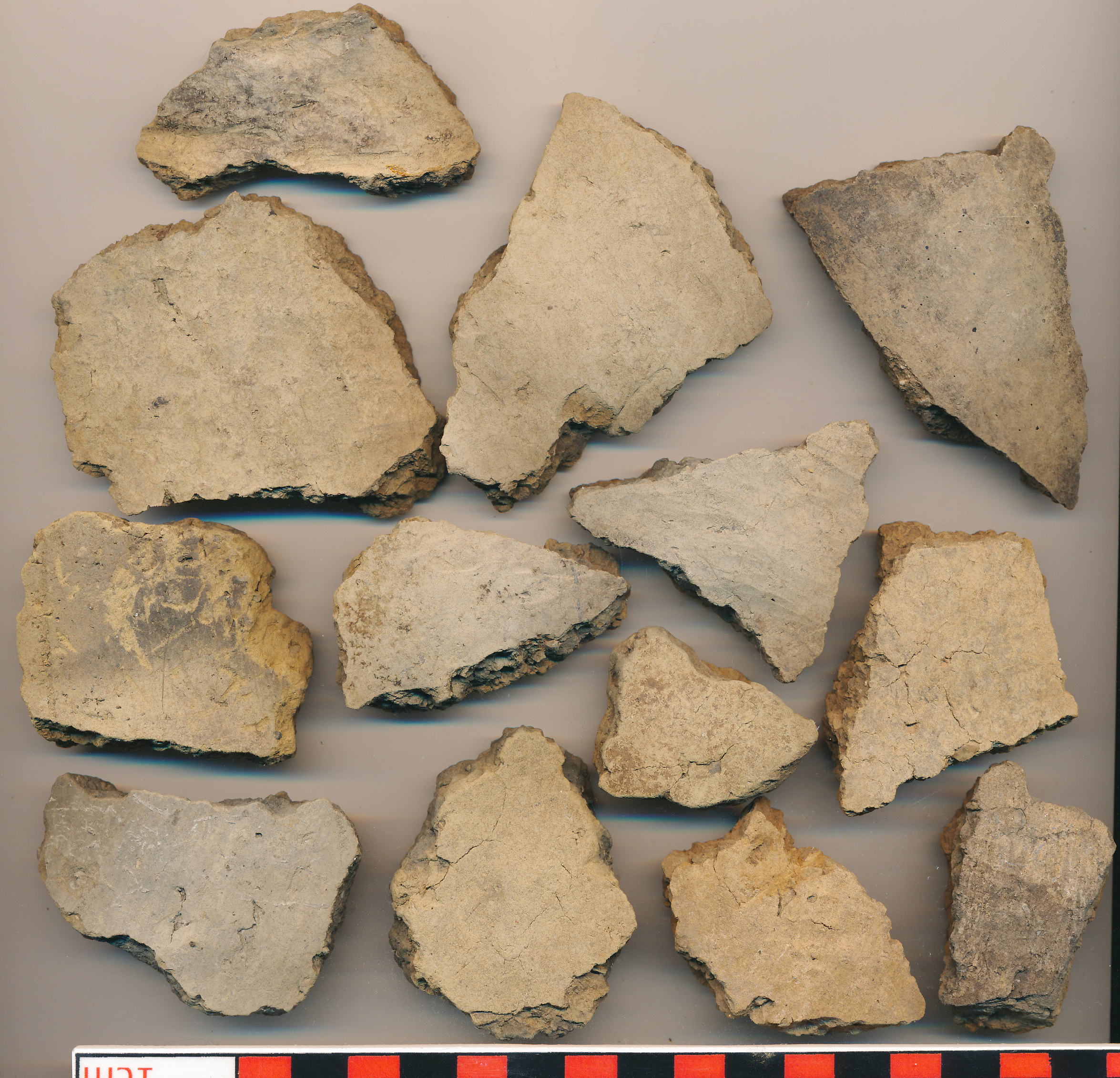 Zömében szürkés téglaszínű, némelyiken fekete foltos külsejű, jellegtelen oldaltöredékek.