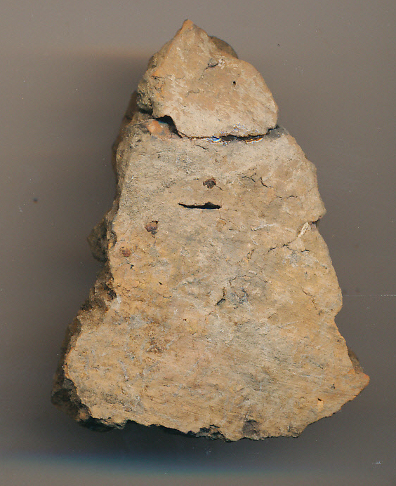 Kívül-belül eldolgozott barnás téglaszínű felületű, fekete törésű, kevés kerámiazúzalékkal soványított, korong nélkül készített edény enyhén íves oldaltöredéke. Két darabból ragasztott.