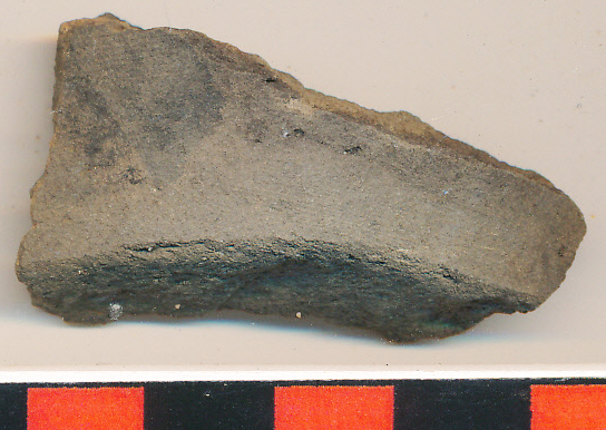 Sötétszürke, homokos anyagú, korongolt kis, vékony falú edény, vágott alja a felmenő fal indításával.