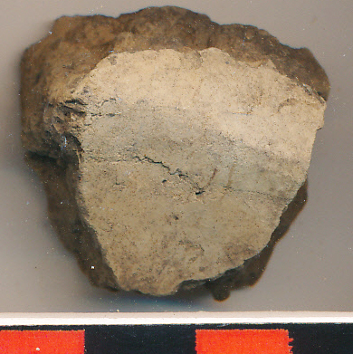 Simított sárga külső felületű, szürke, vágott aljú edény töredéke a felmenő fal kis csonkjával..