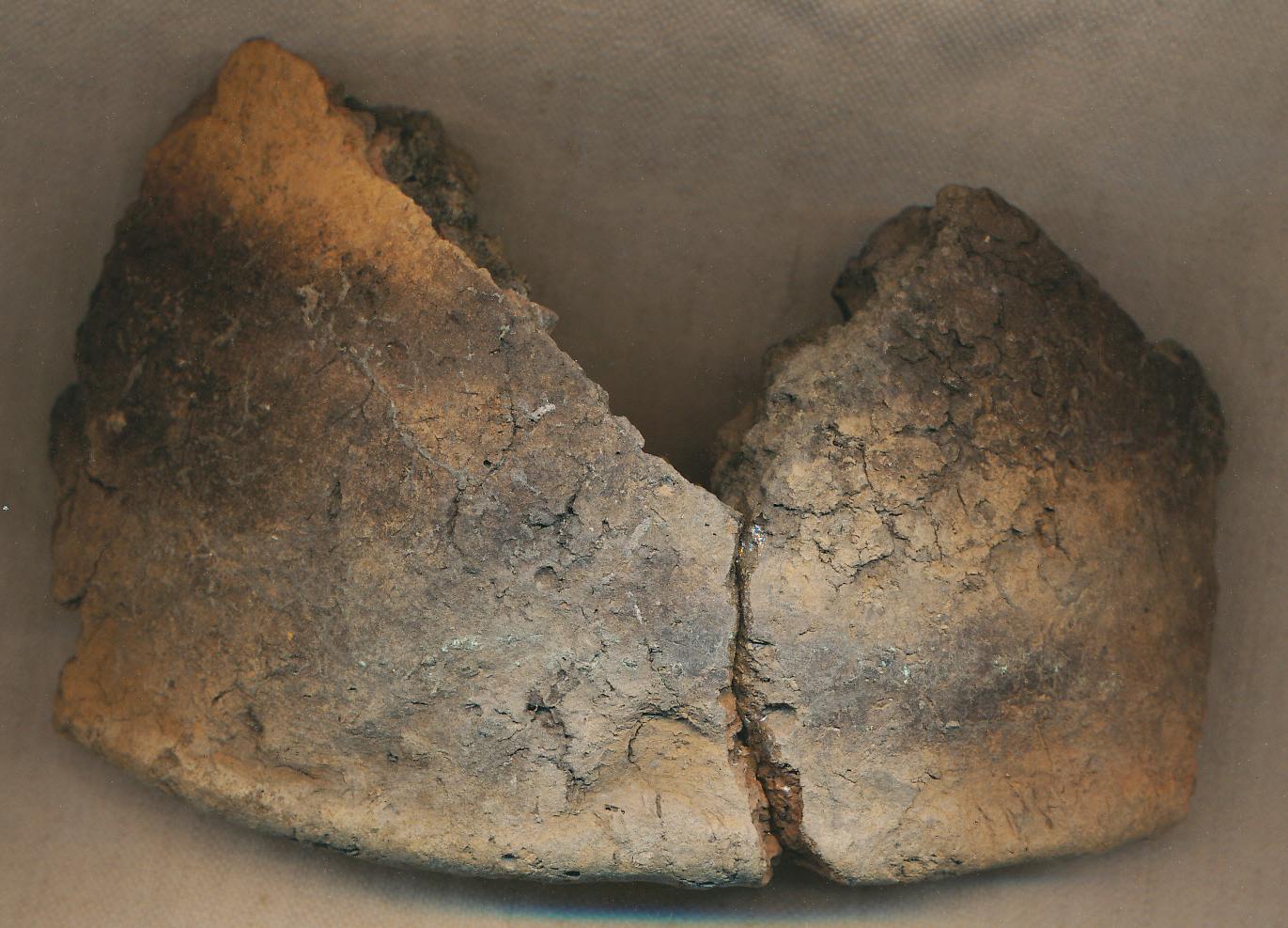 Szürke külső-belső felületű, téglaszínű foltos, kívül egy sávban kormos, fekete törésű, kerámiazúzalékkal soványított, korong nélkül készített félgömbös fedő vastag peremtöredéke. Két darabból ragasztott.
