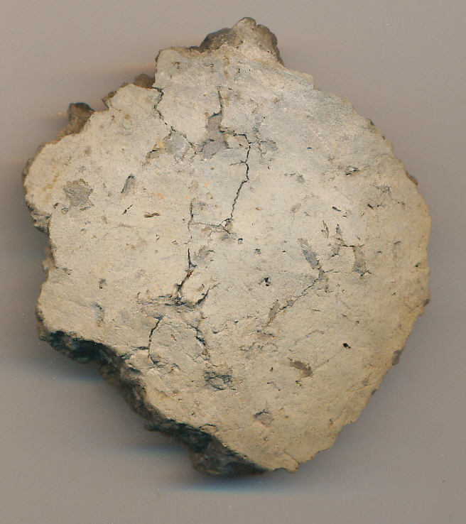 Sárga külső, szürke belső felületű, fekete törésű, korong nélkül készített edény (talán fedő?) vastag falú, íves oldaltöredék.